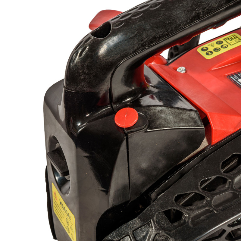 Прочный защитный корпус из качественного ABS-пластика обеспечивает надёжную защиту двигателя от физических повреждений, а также безопасность оператора от контакта с нагретыми элементами бензопилы.