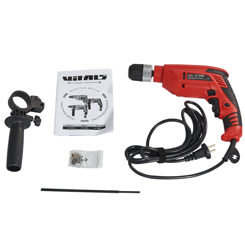 Електричнмй ударний дриль Vitals Master Et 1355HL — потужний інструмент, призначений для свердління отворів в деревині, металі, камені, різних синтетичних матеріалах, а також закручування та відкручування кріпильних виробів (шурупів, гвинтів, саморізів, конфірматів, дюбелів, болтів та гайок) з використанням спеціальних насадок (біт).