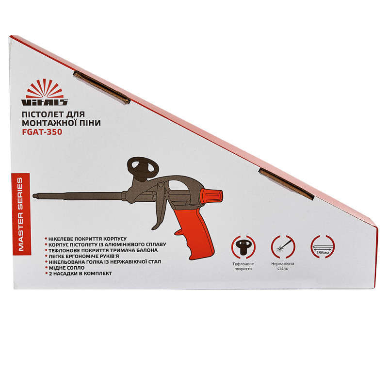Пістолет для монтажної піни Vitals Master FGAT-350 з тефлоновим покриттям тримача балона призначений для монтажу вікон, дверей та інших будівельних конструкцій для заповнення пустот та забезпечення герметичності.