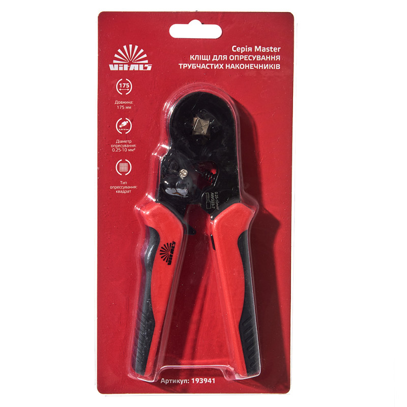 Кліщі для обтискання втулкових наконечників 0,25-10 мм Vitals Master – це інструмент для створення надійних та якісних з'єднань дротів та кабелів за допомогою ізольованих наконечників. Він має такі характеристики.