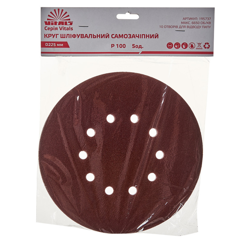 Опис круга шліфувального самозачіпного Vitals 225 мм, 10 отв., з. – 100, 5 од.