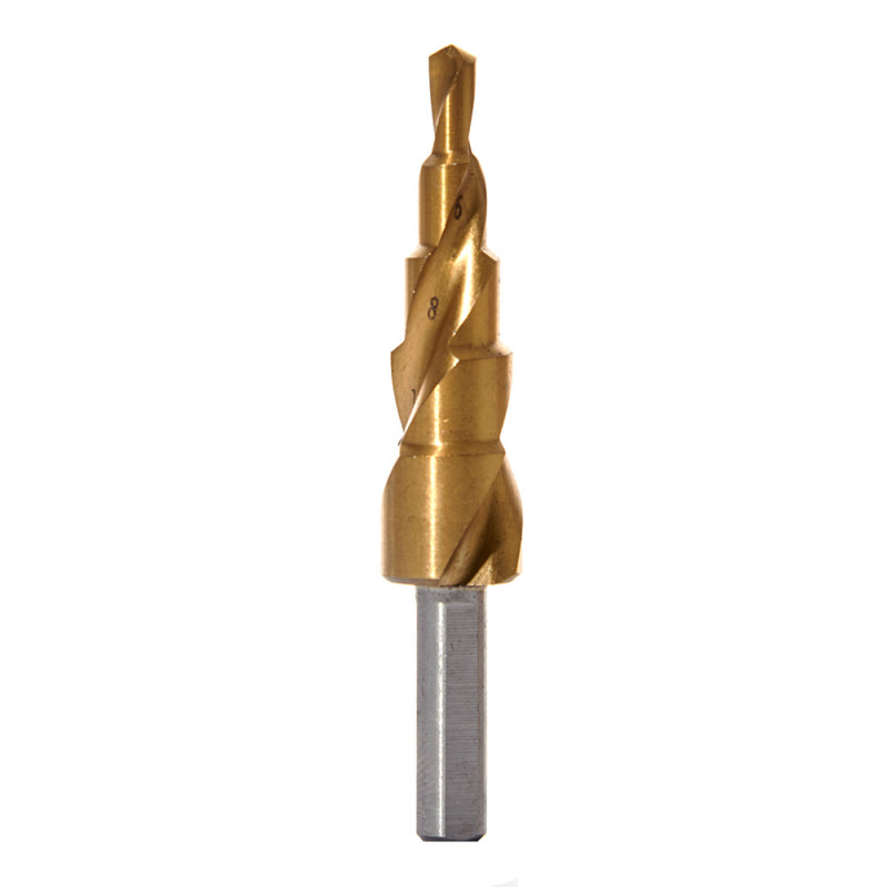 Свердло ступінчасте спіральне 4-12 мм Vitals Master – це універсальне свердло для свердління отворів різного діаметра в різних матеріалах, таких як сталь, алюміній, мідь, пластик тощо. Це свердло звільняє від необхідності безперервно змінювати свердла, тому що має ступінчасту форму з різними діаметрами від 4 до 12 мм. Свердло має високу ефективність при свердлінні отворів великого діаметра, бо має кут заточування 125 °, який забезпечує швидке та легке проникнення в матеріал. Твердість різальних кромок свердла становить 58-62 HRC, що гарантує тривалий термін служби та надійну роботу. Свердло має покриття нітридом титану, який підвищує стійкість ріжучої кромки на максимально довгий термін і надає свердлу золотистого кольору. Ріжучі кромки свердла сприяють створенню відмінної геометрії отвору, що відповідає діаметру свердла. Свердло має циліндричний хвостовик з тригранним фрезеруванням для кращого утримання в патроні і запобігання провертанню. Свердло має спіральну ріжучу кромку, яка забезпечує м'яке та плавне свердління, має підвищену ріжучу здатність та покращує виведення стружки. Свердло ступінчасте спіральне підходить для роботи з електричними та акумуляторними дрилями. Свердло ступінчасте спіральне 4-12 мм Vitals Master – це ідеальний інструмент для свердління отворів різного розміру в різних матеріалах.