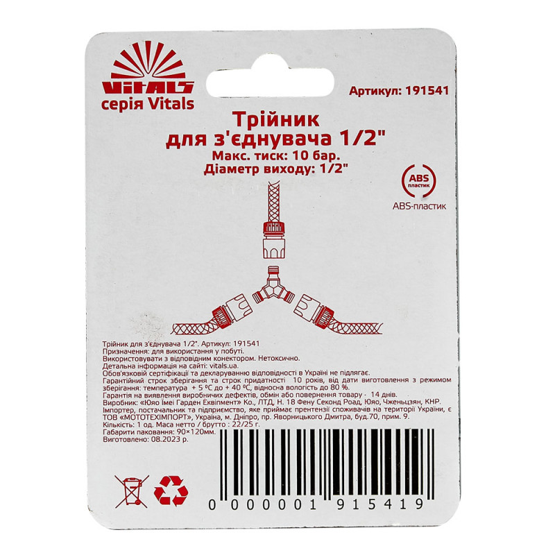 Трійник під конектор ½" Vitals застосовується для розгалуження поливального шланга за допомогою з'єднувачів.
