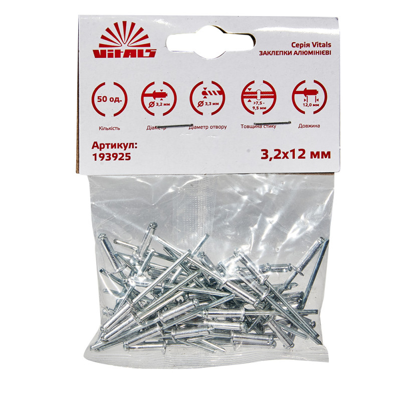 Опис заклепок алюмінієвих 3.2x12 мм (50 од.) Vitals