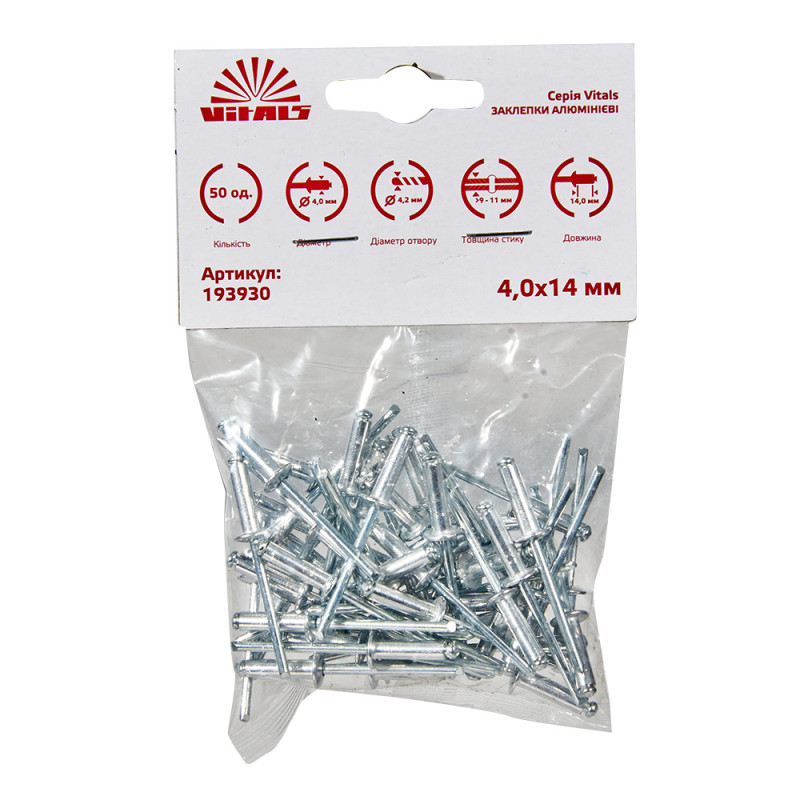Опис заклепок алюмінієвих 4.0x14 мм (50 од.) Vitals
