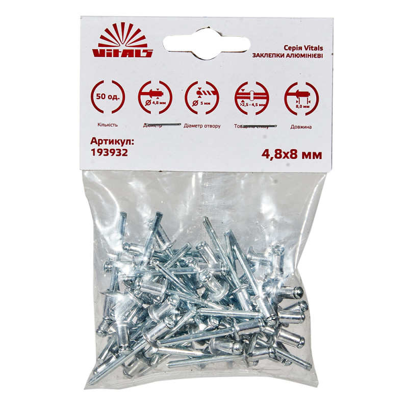 Опис заклепок алюмінієвих 4.8x8 мм (50 од.) Vitals